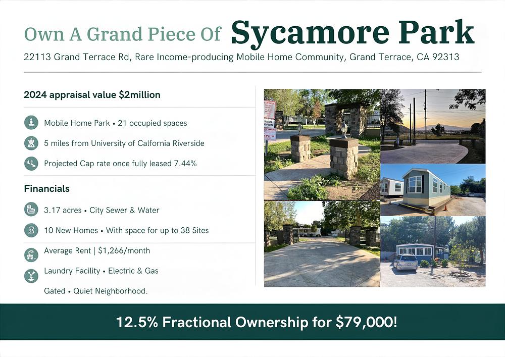 12.5% Fractional Ownership of Sycamore Mobile Home Park for $79,000! $2million appraisal in 2024. 10 new homes out of 21 total. Room for 17 more on site. Annual dividends. Depreciation passed along to owners in the form of a K-1. Gated and quiet community sitting on 3.17 acres with many trees. 10 minutes from UC Riverside. Near the 10 FWY and 215 FWY interchange.