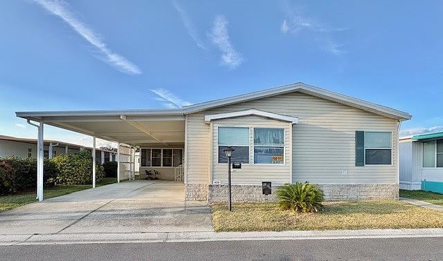 Welcome to this huge 3-bedroom, 2-bath manufactured home offering an open layout and exceptional living space throughout. Enter from the wide driveway into a generous Florida room, perfect for relaxing or entertaining. From there, step inside through the laundry area, complete with stainless steel washer and dryer (approximately 1 year old). The home opens into a large, open-concept main living area that flows seamlessly into a stunning kitchen designed for both style and functionality. The kitchen features abundant cabinetry, a center island with cooktop. The wall oven is original to the home but looks like new. The dishwasher and refrigerator are approximately 1 year old. Just off the kitchen, enjoy a spacious family room, ideal for gatherings or additional living space. All bedrooms are conveniently located at the rear of the home for added privacy. The second and third bedrooms are impressively spacious, while the guest bathroom offers ample storage and a full tub. The primary bedroom is a true retreat and includes all furnishings, a large closet, and a private ensuite bathroom featuring a double vanity, walk-in shower, private toilet area, and a Safe Step walk-in jetted tub (installed approximately 1.5 years ago). Additional highlights include a new AC system, shingled roof installed in 2018, carpet throughout the main living areas and bedrooms, and durable vinyl flooring in the kitchen, family room, and laundry room. This home combines comfort and space ready for you to move right in and enjoy.