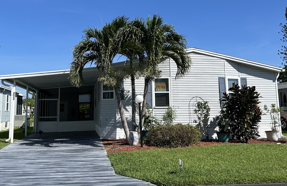 Ready to embrace the Florida lifestyle? This beautifully decorated and beachy-inspired 2-bedroom, 2-bathroom home is spacious with tons of storage throughout and walk-in large closet in the primary suite, fully painted in soothing coastal tones, and truly move-in ready. You ll feel like you're living in a luxury Airbnb only this one is all yours! The home comes fully furnished with stylish, high-quality pieces that perfectly complement the laid-back vibe. Major updates included updated windows and front door (2021), skirting, tile in sunroom, enclosed front porch and carpet in bedrooms (2022), updated sprinklers 2025, with-in the past 10 years the plumbing, roof, A/C have been updated . Enjoy not one, but two enclosed patios one offering serene views of one of the community's five sparkling lakes. Don t miss your chance to own this piece of paradise!