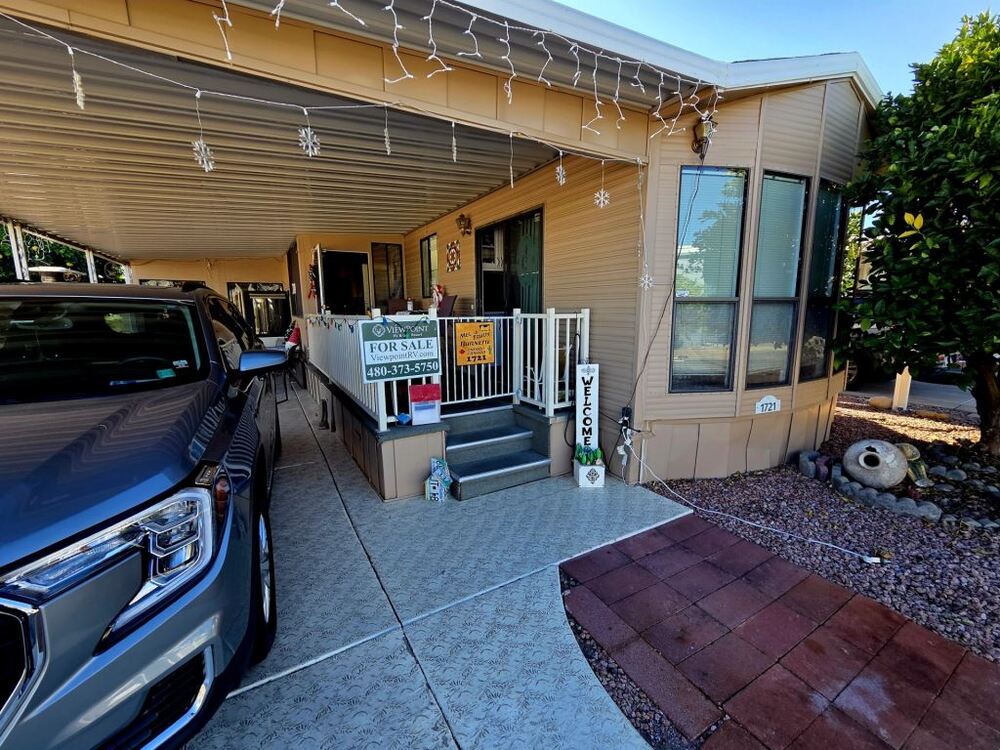 Your next home is waiting for you in ViewPoint RV & Golf Resort, a well-maintained, professionally managed manufactured home community. If you’re just starting out or have a small family, you owe it to yourself to look at this 2 bed/1 bath, 720.00 sq. ft. home. Enter into a living room with laminate flooring; dinette area has a window bench seat and built-in china hutch. Kitchen is bright and sunny with a skylight and window above the sink! Bathroom has a corner tub/shower combo and lots of storage! Spacious bedroom with a window bench seat! Hallway entry to the Arizona room addition. South facing windows make this Arizona room bright and sunny! Second bedroom is just off the Arizona room, complete with closets. Great outdoor living space in the carport! Small side yard. Deck under the carport. Two citrus trees! Talk to one of our representatives today by calling and schedule a viewing! 480-373-5750