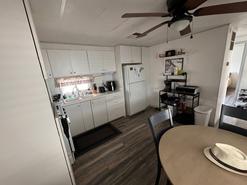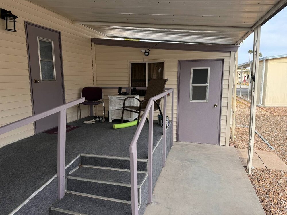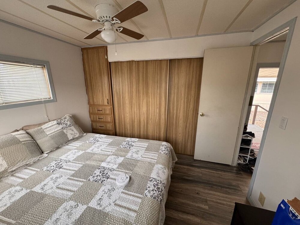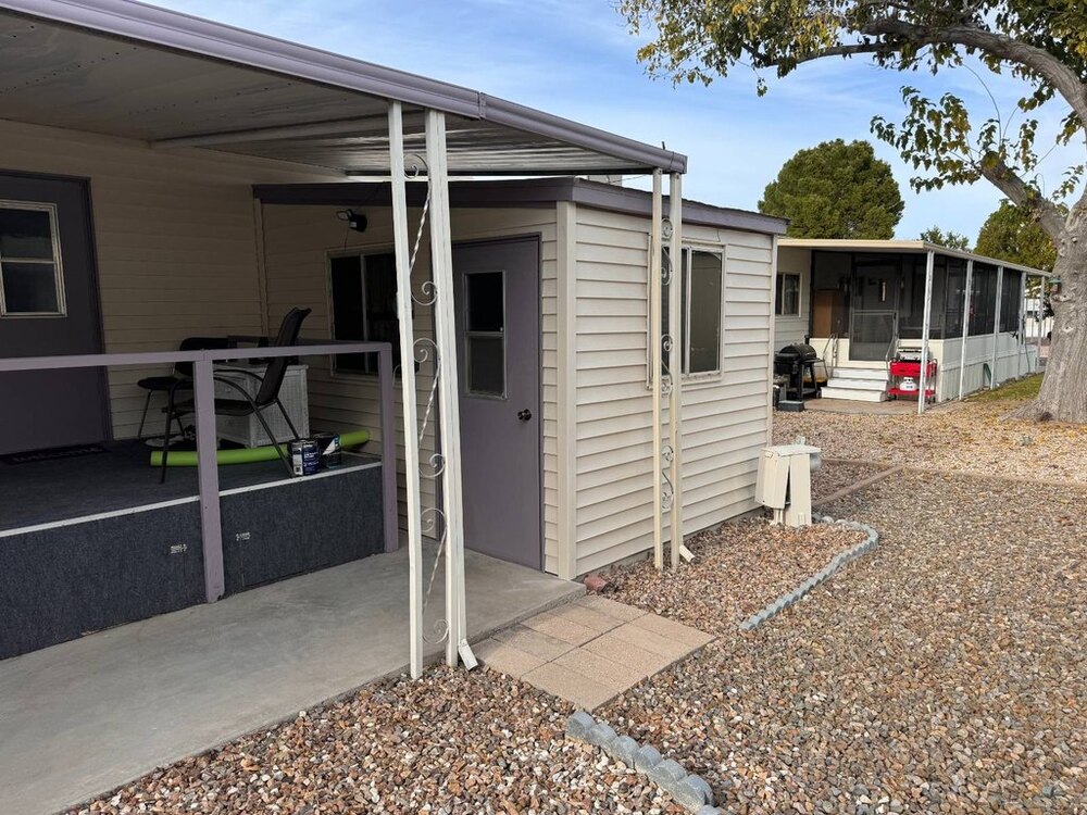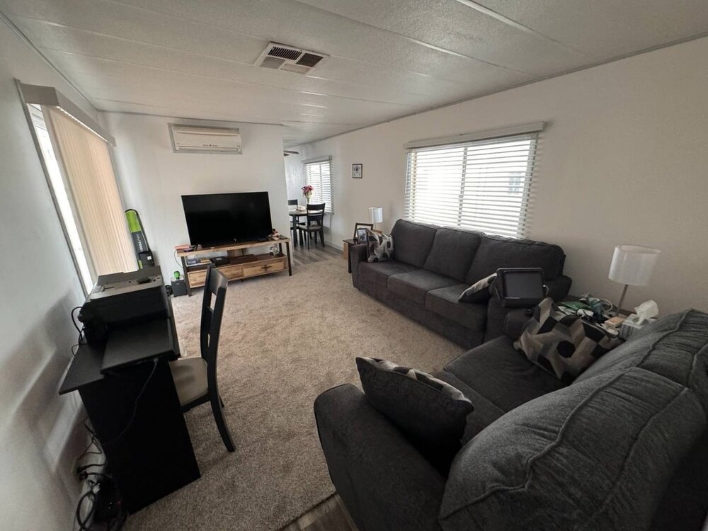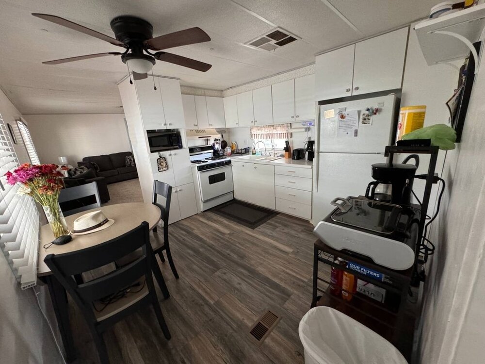 Step into this beautifully maintained single-wide home featuring a thoughtfully designed split floor plan. This layout provides the perfect balance of privacy and shared living spaces, ideal for relaxing and entertaining. At one end of the home, the primary bedroom suite offers a private retreat, complete with an en-suite bathroom featuring a walk-in shower. At the opposite end, the secondary bedroom is equally inviting, with built-in shelving and a sliding closet door for practical storage. A nearby guest bathroom includes a shower/tub combination with a tub window to let in natural light, creating a bright and welcoming atmosphere.The heart of the home is the open-concept living area, which seamlessly blends the living room, dining nook, and kitchen. The spacious kitchen is equipped with modern appliances, including a gas stove with a hood, refrigerator, microwave, garbage disposal, and filtered water system. A sliding glass door off the living room opens to the outdoor patio, extending your living space and making it perfect for gatherings or quiet evenings outdoors. This move-in-ready home is designed with both functionality and style in mind, offering comfortable living spaces, plenty of storage, and thoughtful upgrades throughout.