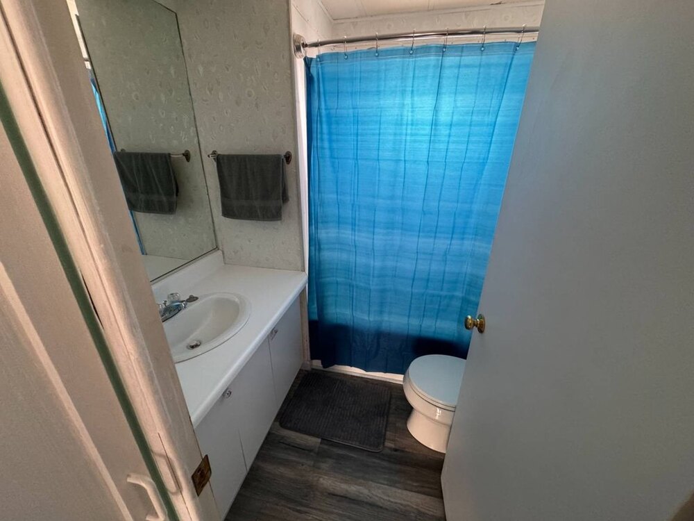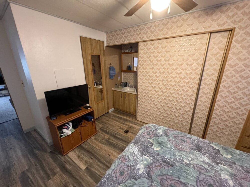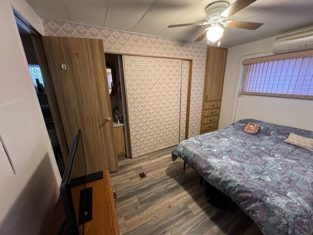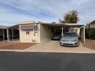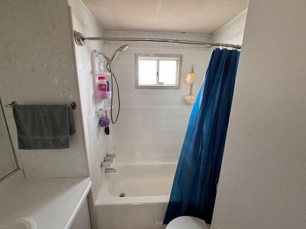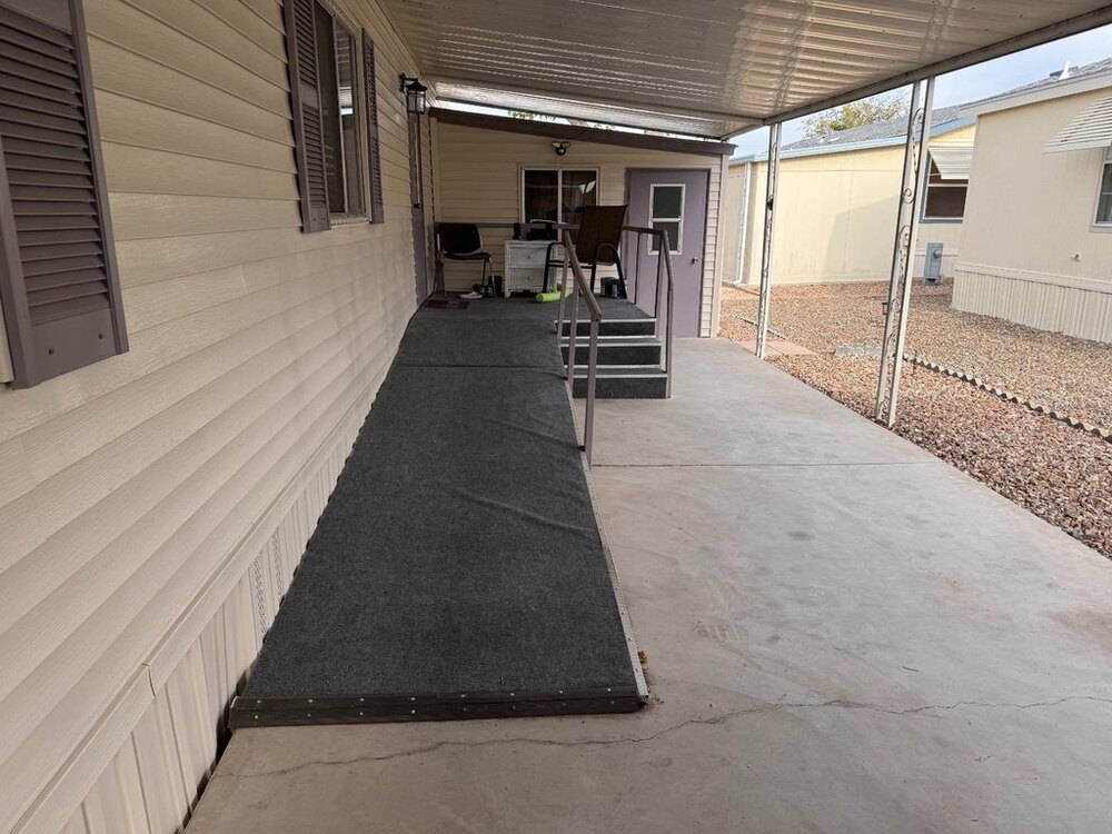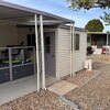 Step into this beautifully maintained single-wide home featuring a thoughtfully designed split floor plan. This layout provides the perfect balance of privacy and shared living spaces, ideal for relaxing and entertaining. At one end of the home, the primary bedroom suite offers a private retreat, complete with an en-suite bathroom featuring a walk-in shower. At the opposite end, the secondary bedroom is equally inviting, with built-in shelving and a sliding closet door for practical storage. A nearby guest bathroom includes a shower/tub combination with a tub window to let in natural light, creating a bright and welcoming atmosphere.The heart of the home is the open-concept living area, which seamlessly blends the living room, dining nook, and kitchen. The spacious kitchen is equipped with modern appliances, including a gas stove with a hood, refrigerator, microwave, garbage disposal, and filtered water system. A sliding glass door off the living room opens to the outdoor patio, extending your living space and making it perfect for gatherings or quiet evenings outdoors. This move-in-ready home is designed with both functionality and style in mind, offering comfortable living spaces, plenty of storage, and thoughtful upgrades throughout.