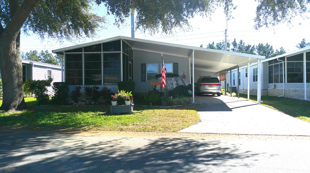 7343 Harbor View Drive is located in a 55+ resort style land leased community in beautiful Lake Griffin Harbor Village. Enjoy lake style living with beautiful sunsets. NICE PRICE REDUCTION on this spacious home is over 1400 sq feet of living space. Entryway has natural skylight and cabinetry for extra storage. Enter into your extra wide hallway. Open concept living area with finished walls, nice bright kitchen with natural skylight, center island and plenty of cabinetry. French doors leading to your large master bedroom with vaulted ceilings, wall to wall closet, and french doors leading to your ensuite with beauty area and separation for your walk in shower and water closet! 2nd bedroom is spacious too. 2nd bathroom has tub and storage for linens, etc. There is also a separate laundry room. Double pane windows throughout. Sliding glass doors lead to your lanai with ceiling fan. There is an extra deep carport with plenty of room for multiple cars and your golf cart. Exterior lot with large backyard with palm trees and an avocado tree. You definitely want to tour this beautiful home. Call us and start living your Florida dream!