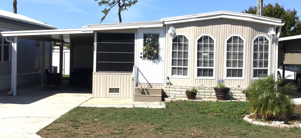 Discover this freshly painted charming one-bedroom, one-bathroom home nestled in the vibrant 55+ Southern Charm community! Step into a spacious Florida Room with new carpet and a beautifully updated kitchen featuring a gas stove, new cabinetry, quartz countertops, new stainless-steel refrigerator and new stainless steel microwave. Additional highlights include a walk-in pantry, dedicated laundry room with washer and a cozy bedroom with a queen-size bed. The bathroom boasts a new power-flush toilet, new sink and vanity, and the home offers recent upgrades such as new: water heater, flooring, wiring, and circuit box. Enjoy the comfort of a heating and A/C system that's just a year and a half old. Outside, you'll find a shaded carport for convenient parking and large patio in the back. Don't miss out on this beautifully updated home. Restrictions and conditions may apply.