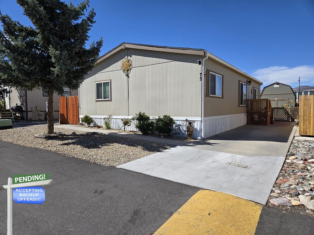 Features: Welcome to this beautifully maintained 2016 home offering 3 bedrooms, 2 bathrooms, and 1,232 sq. ft. of comfortable living in a family-friendly park with nice views. Inside, you'll find modern touches throughout, including luxury vinyl plank flooring and custom blinds. The spacious master suite features a walk-in closet and ensuite bathroom, while each bedroom, as well as the dining area, is enhanced with ceiling fans for added comfort. The open-concept kitchen flows seamlessly into the dining area and living room, which highlights a stylish feature wall. A separate laundry room off the kitchen provides additional storage space and could easily double as a pantry. Washer, dryer, and fridge all included. Stay cool year-round with both a swamp cooler and air conditioning. The outdoor space is equally impressive, with a fully fenced yard featuring low-maintenance river rock landscaping for a weed-free yard, complemented by paver walkways, a drip system, established plants, raised flower beds, and decorative wine barrel planters. For added convenience, two storage options include a 10x16 Tuff Shed with loft and a smaller vinyl shed.
