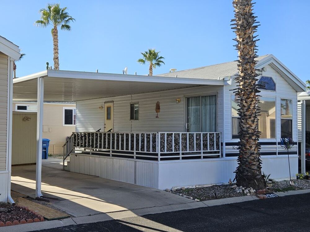 The interior of the home is filled with natural light. Flooring is a combination of ceramic tile floors, with wood laminate floors in the bedroom. Windows are adorned with stylish wood valances. Cabinetry has been painted in a creamy, off-white color. The Southwest color palette will compliment any décor. Numerous upgrades include Granite Kitchen Countertops, new Frigidaire Black Slate French Door Refrigerator and Range, new Bosch full sized Dishwasher, and a deep Stainless Steel Kitchen Sink. The beautiful bath has a custom tile Vanity countertop with a Vessel Sink, custom tile walk-in shower, and a high-end Toto commode with Bidet. The bedroom features 2 large closets and built-in cabinetry. This home comes unfurnished. The large shed has an unfinished interior but has electricity. The carport is wide, and it will fit a large vehicle plus a golf cart. For the golfer, this home is a short walk to the golf course.