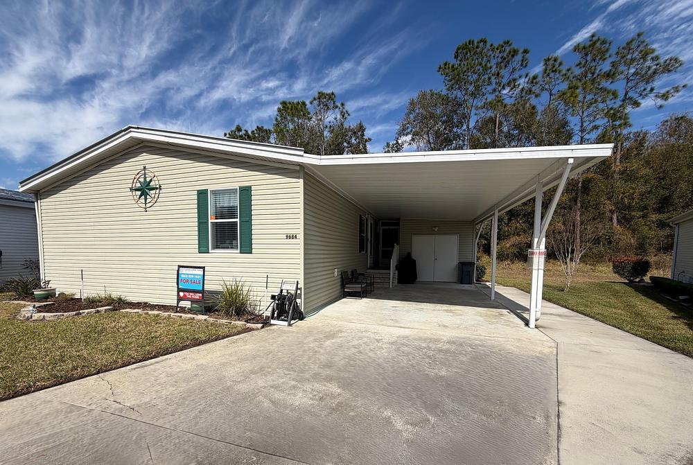 Don’t miss out on this immaculate 2003 Homes of Merit! This 1344 SF home offers our most popular split floor plan with 3 bedrooms and 2 bathrooms. The kitchen was completely remodeled in 2017. The black stainless-steel appliances are less than 3 years old! The washer and dryer are only 1 year old. The primary bedroom is generous in size and offers a walk-in closet. The ensuite has a walk-in linen closet, new vanity, and walk-in shower with sliding glass doors. On the opposite end of the home, you are welcomed by the guest wing. The guest bathroom offers a tub/shower combo. The two guest bedrooms are located outside of the bathroom. At the center of the home, you will find the dining room and living room. Vaulted ceilings run throughout the home. The oversized lanai is located at the rear of the home just off the eat in nook. The home has a 2022 metal roof and is being offered partially furnished. This is a “Must See”! Inquiry now to book your tour.