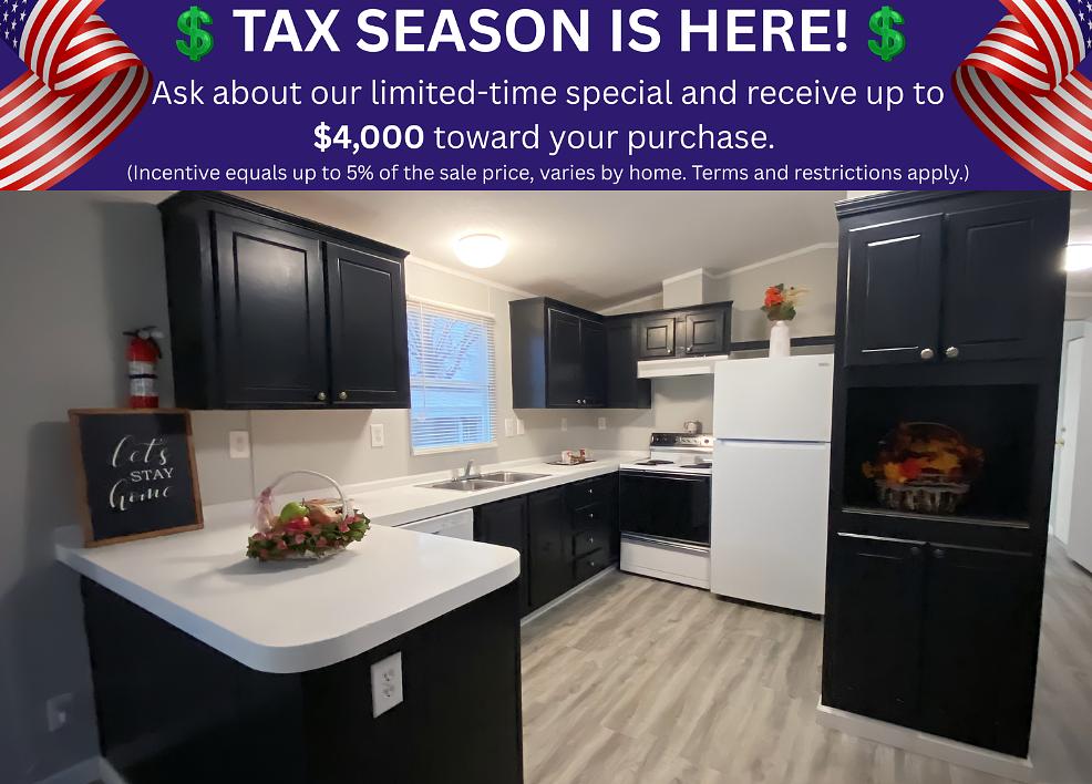 TAX SEASON IS HERE! Ask about our limited-time special and receive up to $4,000 toward your purchase. (Incentive equals up to 5% of the sale price, varies by home. Terms and restrictions apply.)