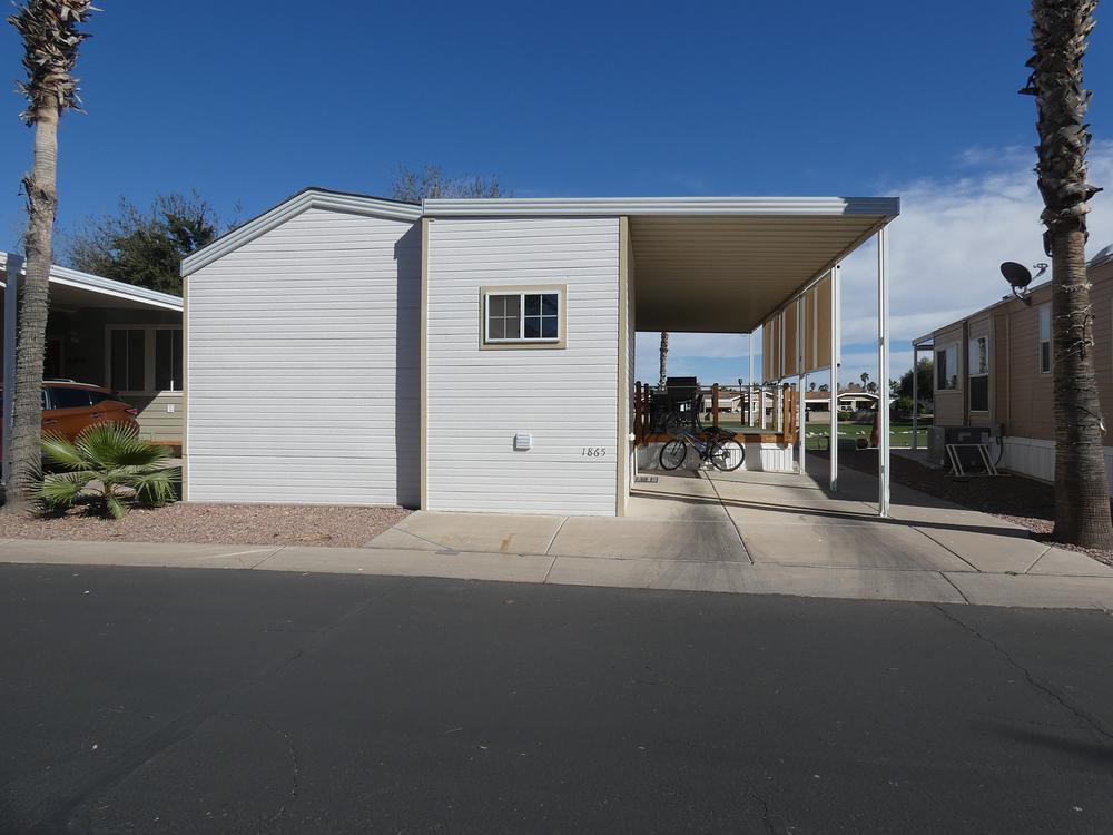 Located at 1865 Oasis Drive, this 1-bed/1-bath park model is a must see. Ideally located on the 18th green, this home boasts of a large deck, spacious back area and a gorgeous view! The large shed has a full size washer and dryer and plenty of storage room. Inside you will find a u-shaped kitchen with upgraded counter tops, a walk-in shower and the living room facing the golf course. Imagine, sitting on your deck watching the beautiful Arizona sunrises, or to entertain guests. Off the deck, the area is ready for you to add your personal touch by adding patio, for additional entertaining space. Did you know after purchasing your home you can sub lease it? That s right, your home can work for you! Don't wait to view this great home contact the sales office today to schedule your private viewing.