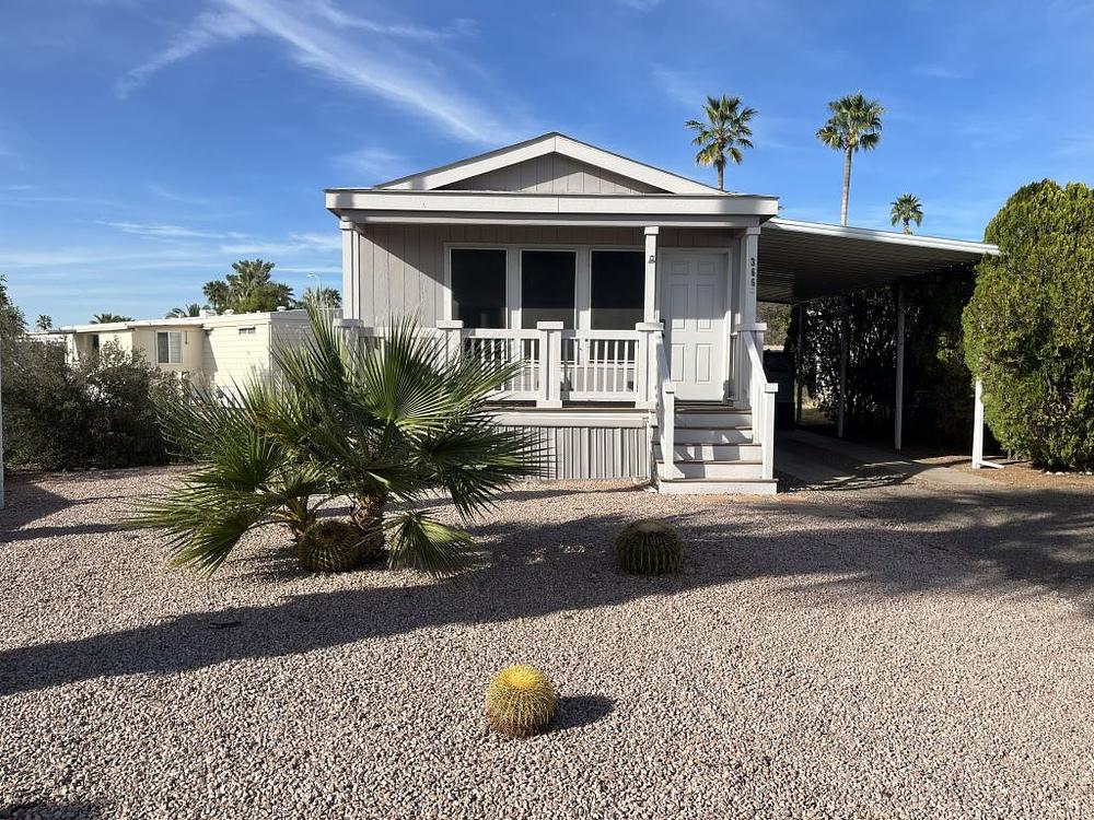 Welcome to Hacienda de Valencia, an age-qualified active and vibrant community where you can find your dream home. We have a charming and beautiful house- a 2010-built, 2-bedroom, 2-bath home for sale offering 792.00 sq ft of thoughtfully designed living space. Located in Mesa, this property provides the perfect mix of modern amenities and timeless charm, featuring an open-concept floor plan, hardwood floors, high ceilings, natural light, and more. The spacious suite offers a peaceful retreat, complete with a bathroom that has dual vanities, a shower, and a large closet. Outside, you'll enjoy features like a private backyard and low-maintenance landscaping. Situated in the desirable Hacienda de Valencia, residents have access to a range of premium amenities, including a resort-style pool, fitness center, and two clubhouses. Conveniently located near shopping, dining, major highways, parks, and public transportation, you'll have everything you need just minutes away. Whether you're seeking relaxation or recreation, this community has it all. Ask us about financing options. Call today to schedule a tour!