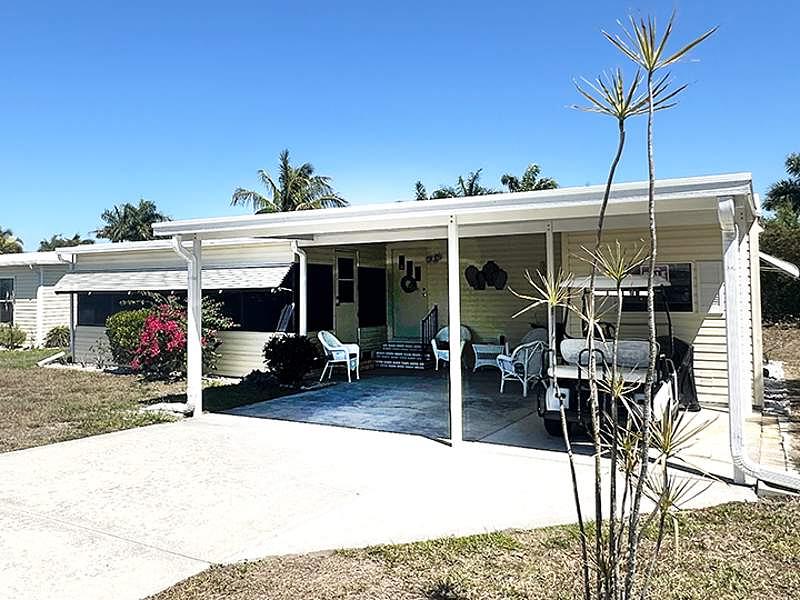 This 800+- square foot manufactured home at Bonita Terra in Bonita Springs, FL features 1 bedroom and 1 bathroom. Built in 1987 by Bay Homes, this cozy home offers a spacious living area, a kitchen with modern appliances, and a charming lanai perfect for enjoying the Florida weather. The bedroom is generously sized with ample closet space, and the bathroom is beautifully updated with a tiled shower and modern fixtures. With a convenient carport and additional storage space, washer and dryer (and golf cart) this home provides all the comforts for a relaxed lifestyle in a vibrant community. Leased Land.