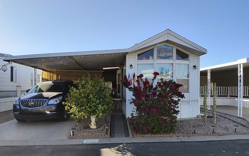 This 456 square foot Park Model home at Superstition Sunrise in Apache Junction, AZ, built in 1993 by Chariot Eagle, offers 1 bedroom and 1 bathroom. The interior features a cozy living room, master bedroom, and a functional kitchen equipped with an oven, fridge, microwave, washer, dryer, and hot water heater. The home also includes central A/C for added comfort. On the outside, the home boasts a carport, 2 sheds, patio, and aluminum siding for durability and convenience.