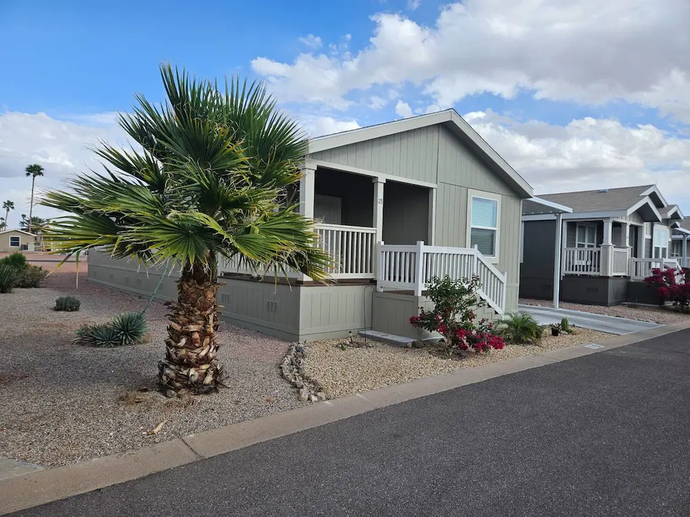 This beautiful 2023 Cavco home will be ready this month! It is the popular split bedroom plan with a huge covered front porch to experience the gorgeous AZ Sunsets. This two bedroom two bath home is a open floor plan featuring a spacious kitchen Island, next to the dining area and open to the living room. Kitchen features a Gas Stove, SS Fridge and Dishwasher as well as additional Pantry cabinets. Washer and Dryer are also included! Call us today as this one wont last long! Interior photos pending.